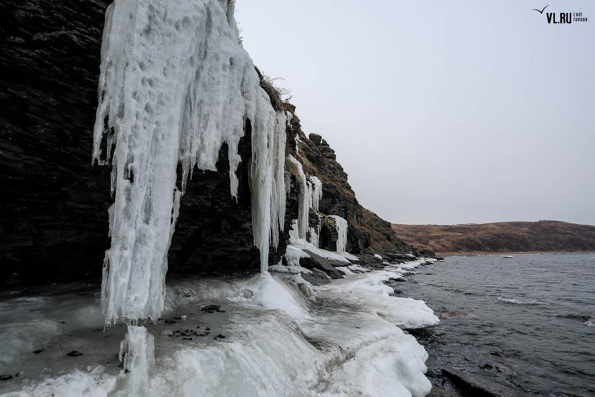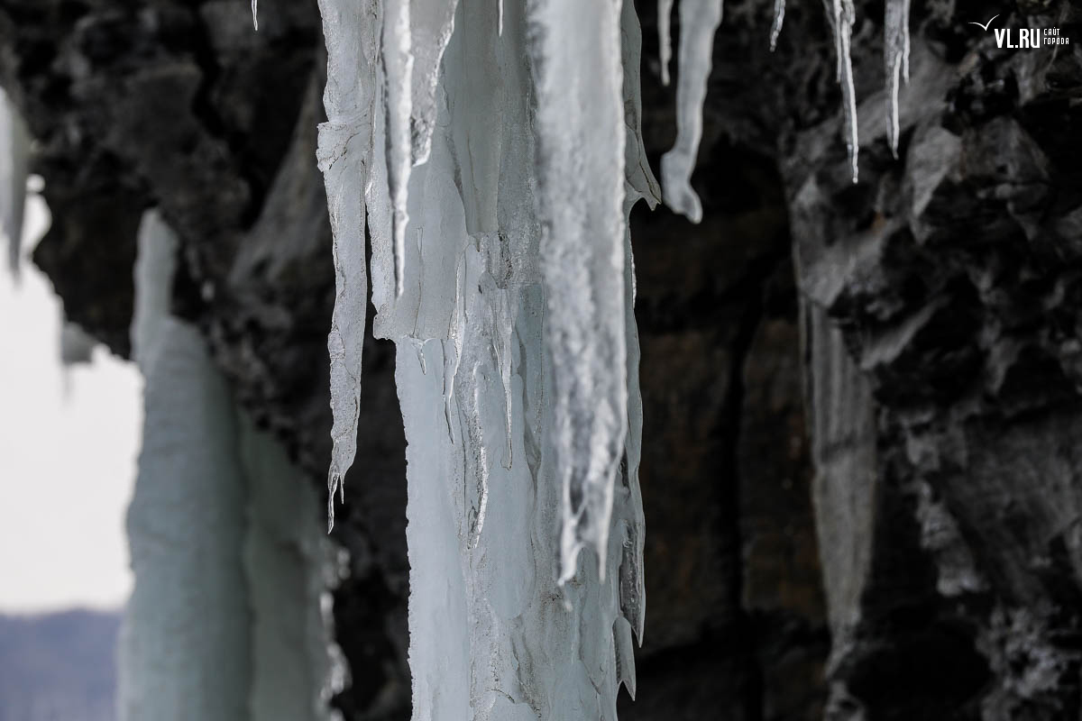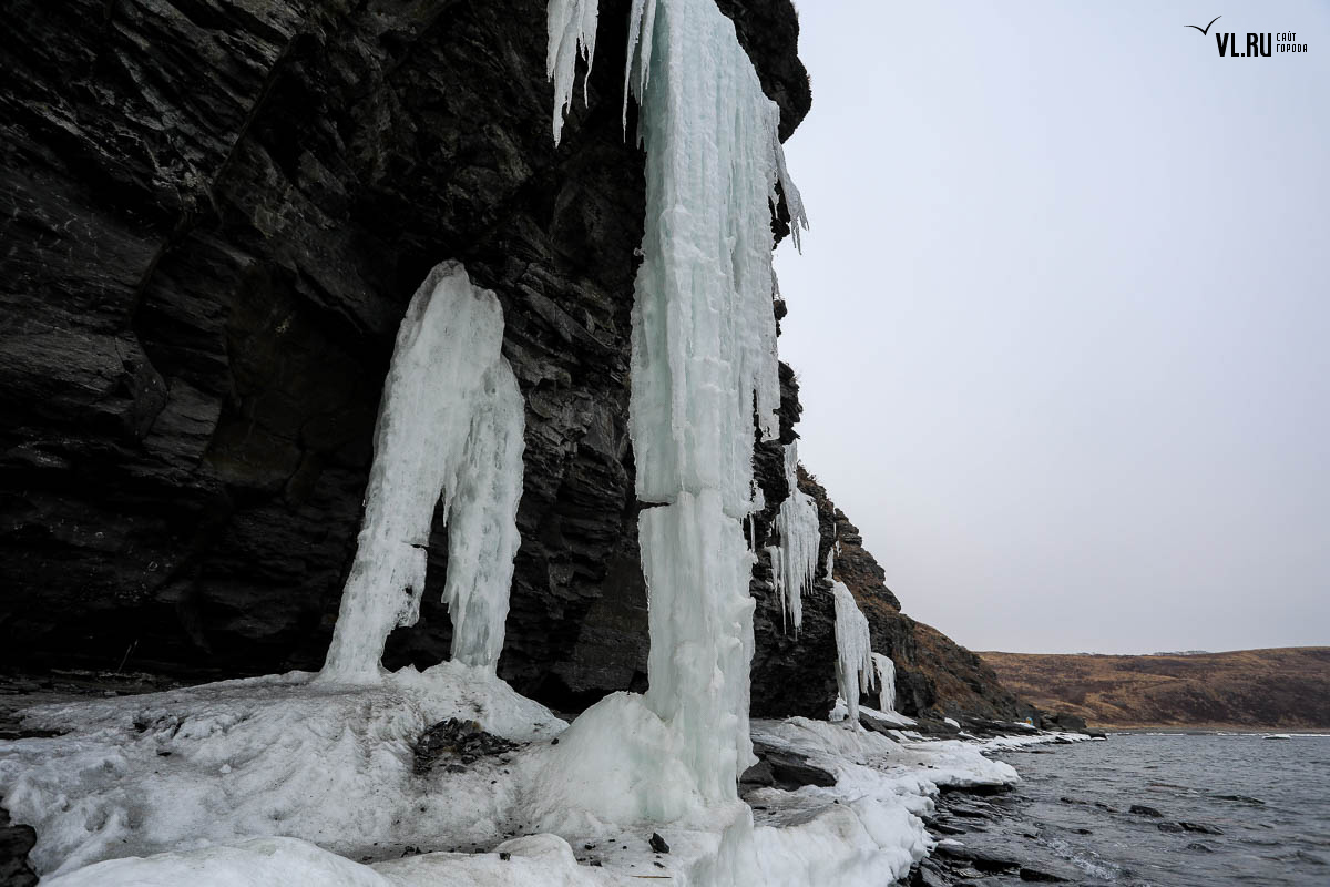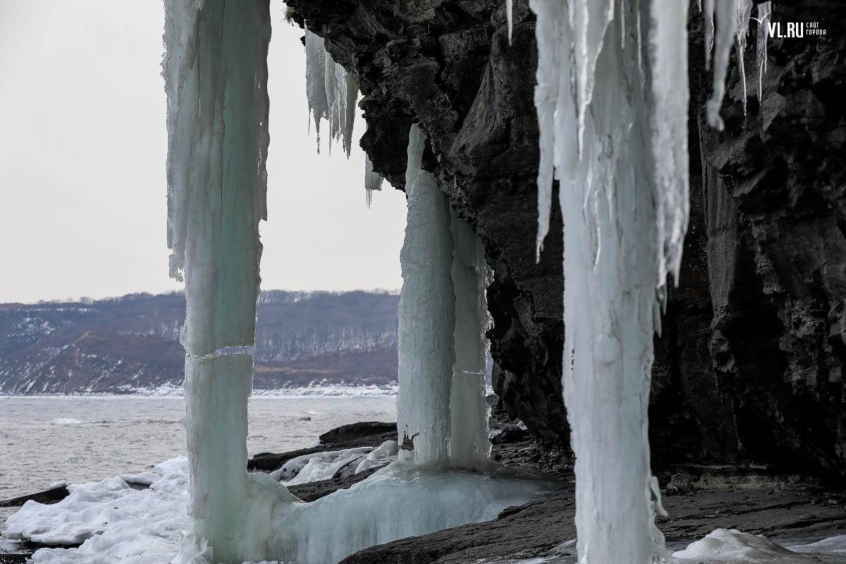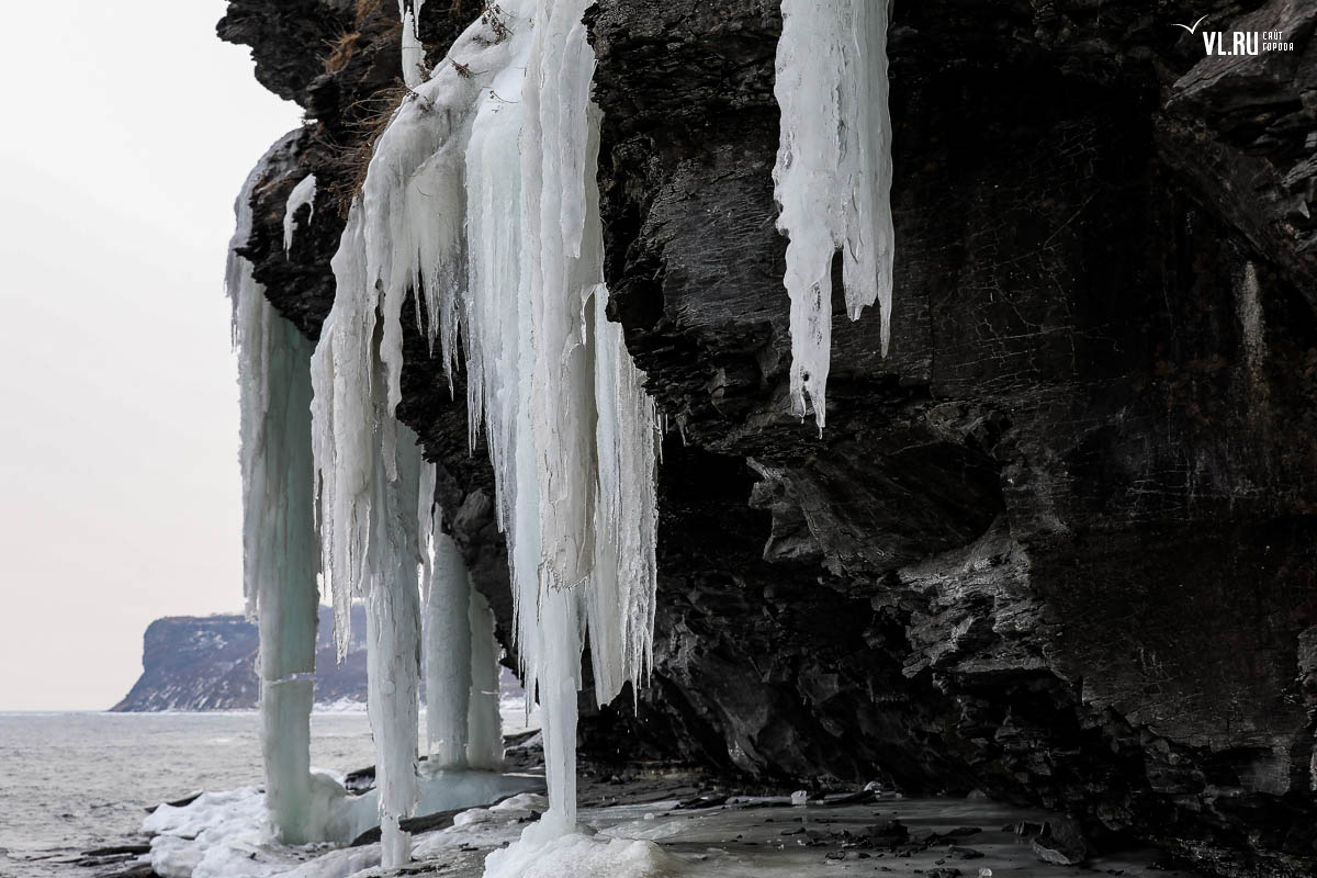 Русском острове. Длинные сосульки, украшающие мыс, нередко попадают в