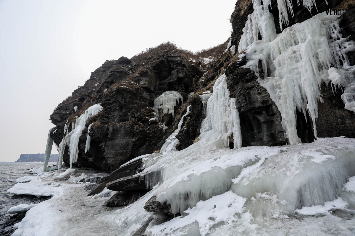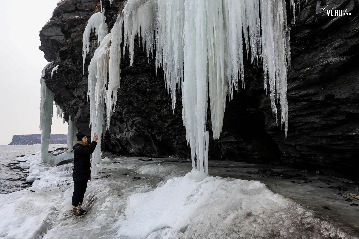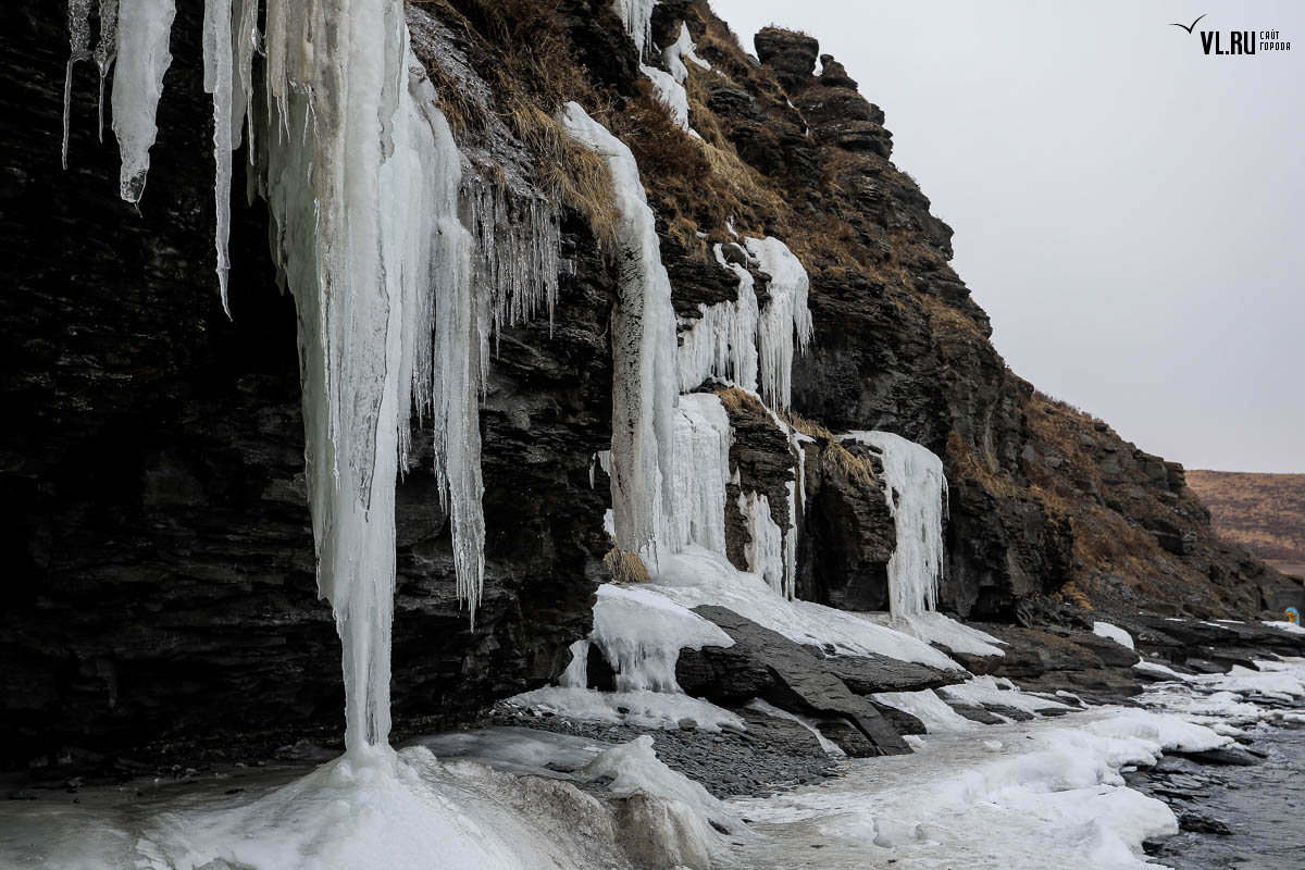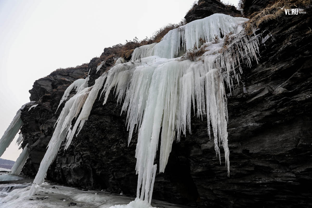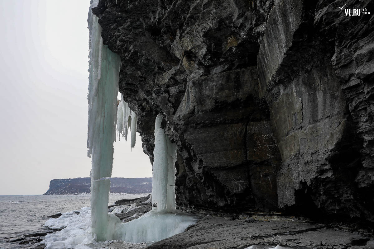 Русском острове. Длинные сосульки, украшающие мыс, нередко попадают в