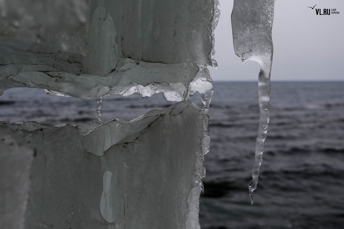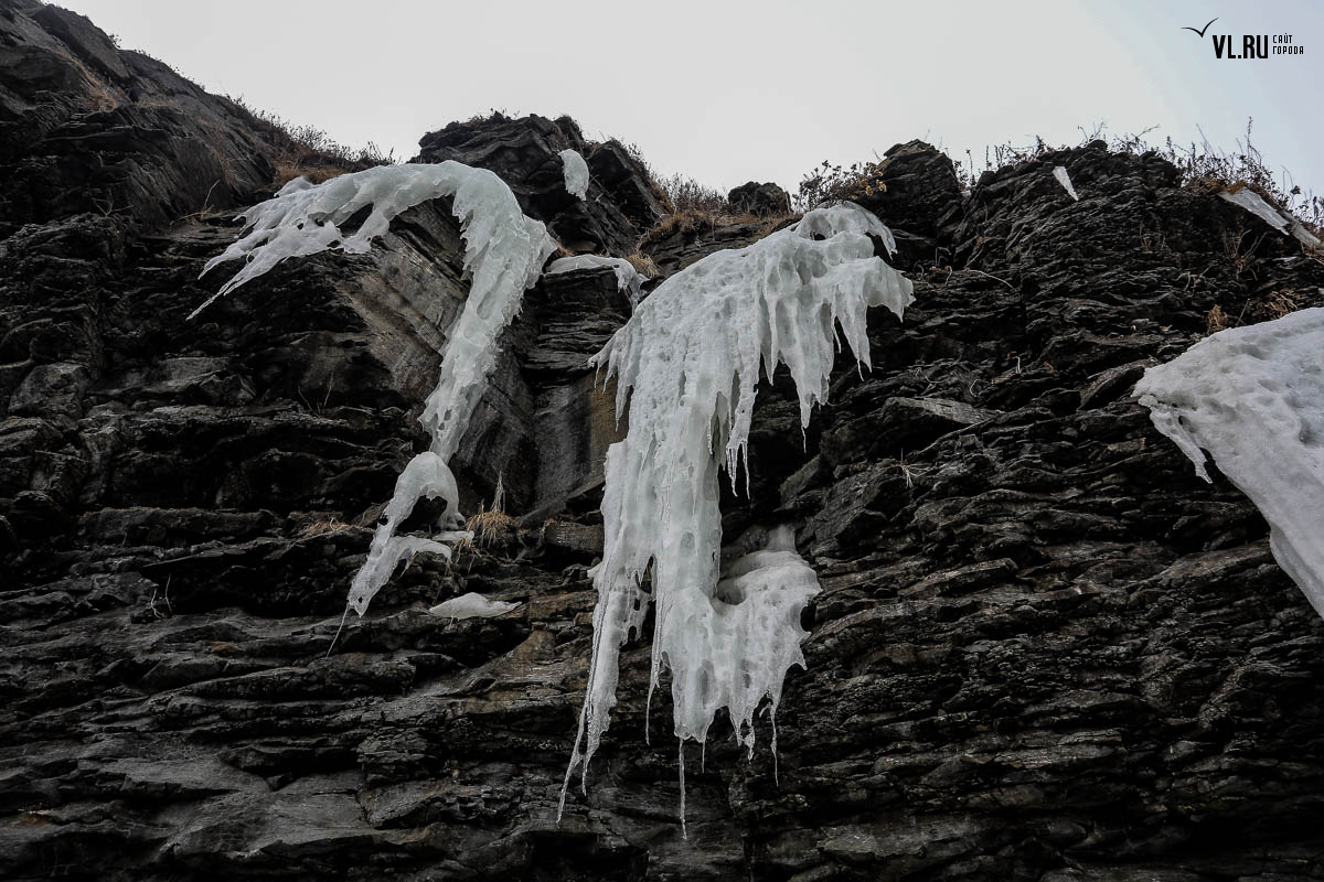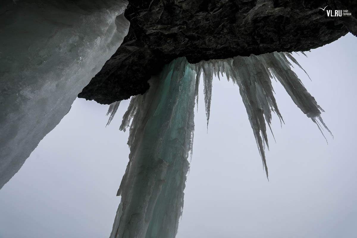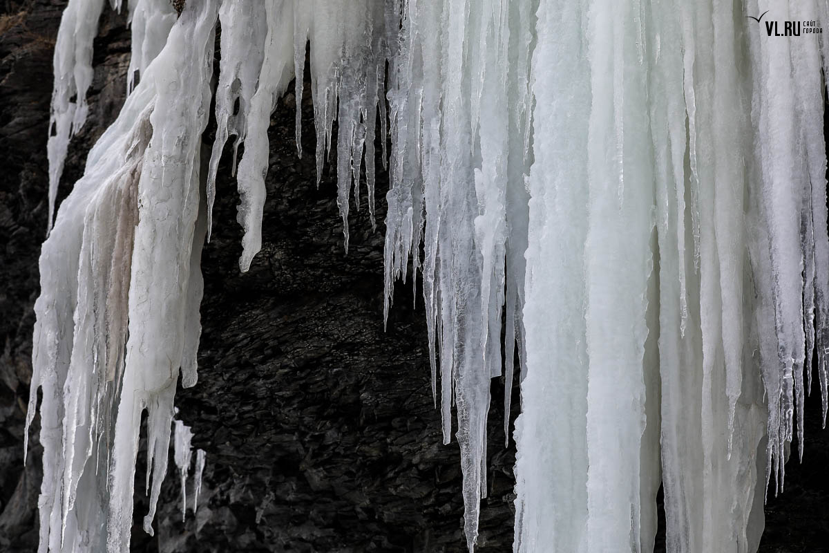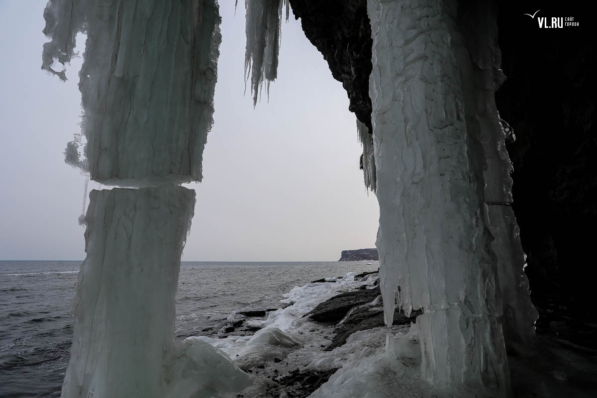 Русском острове. Длинные сосульки, украшающие мыс, нередко попадают в