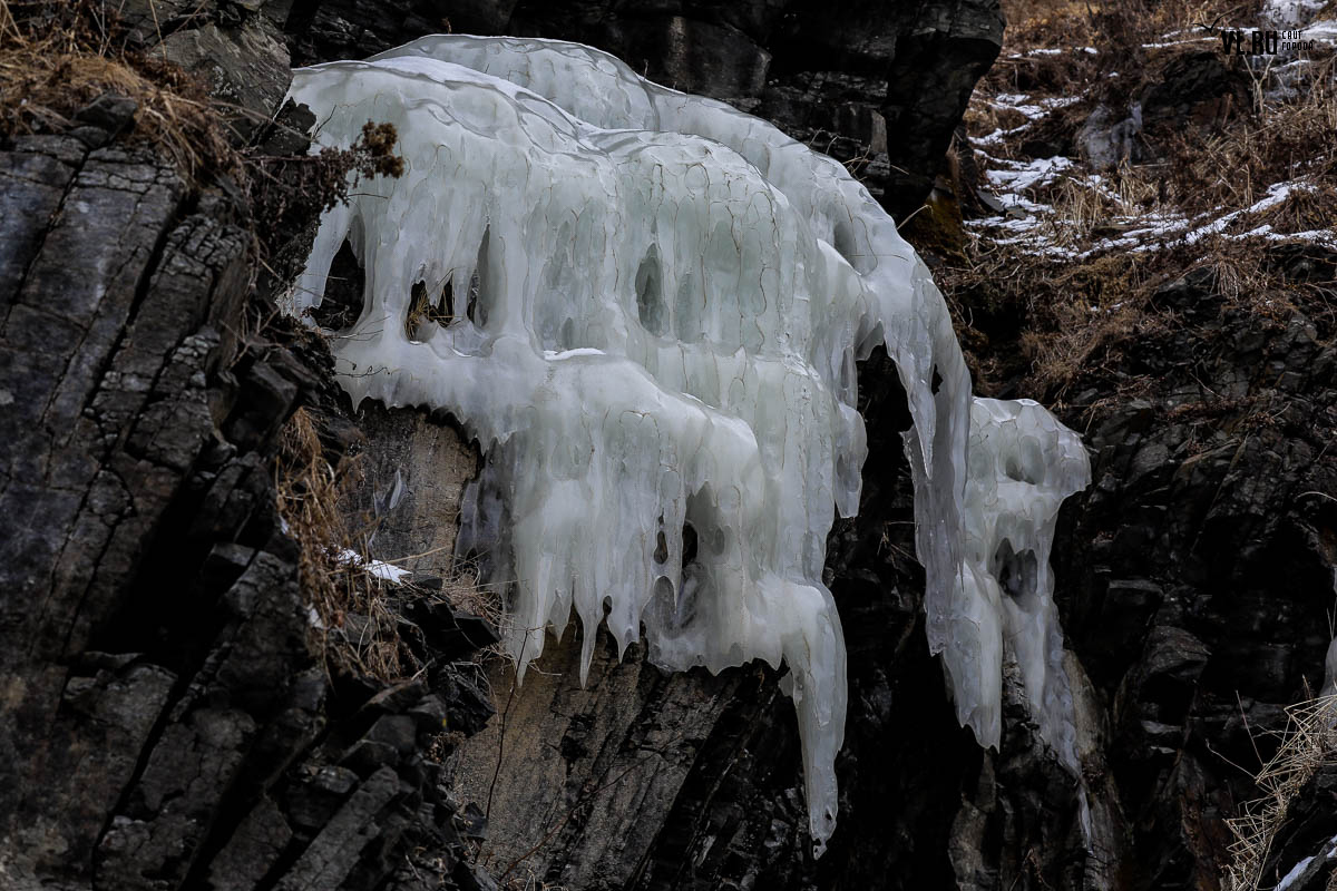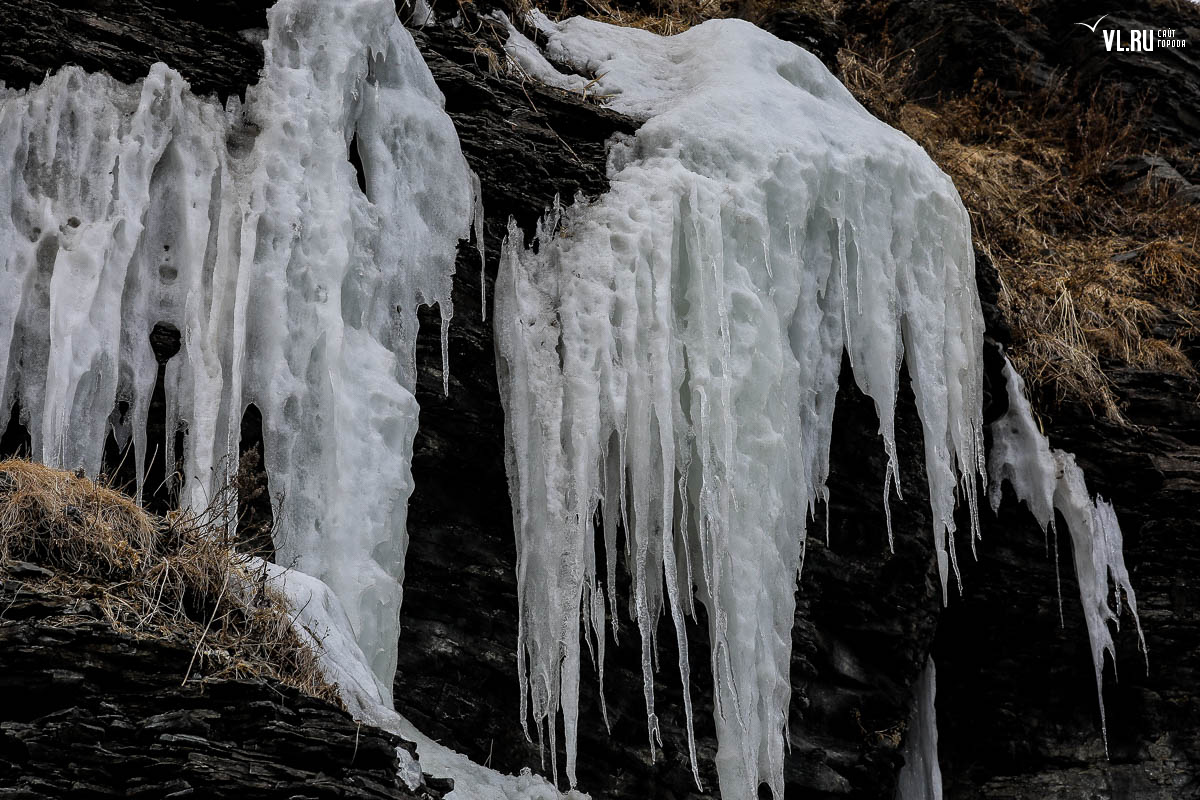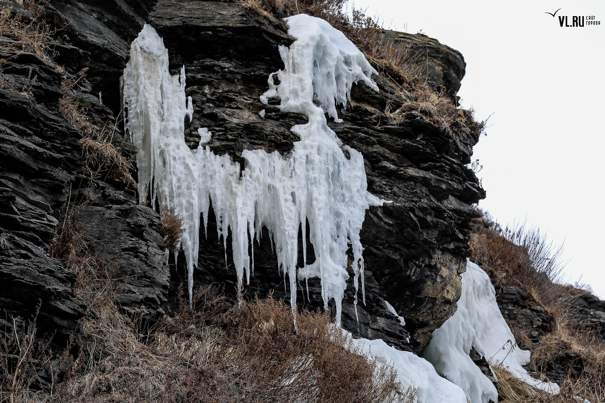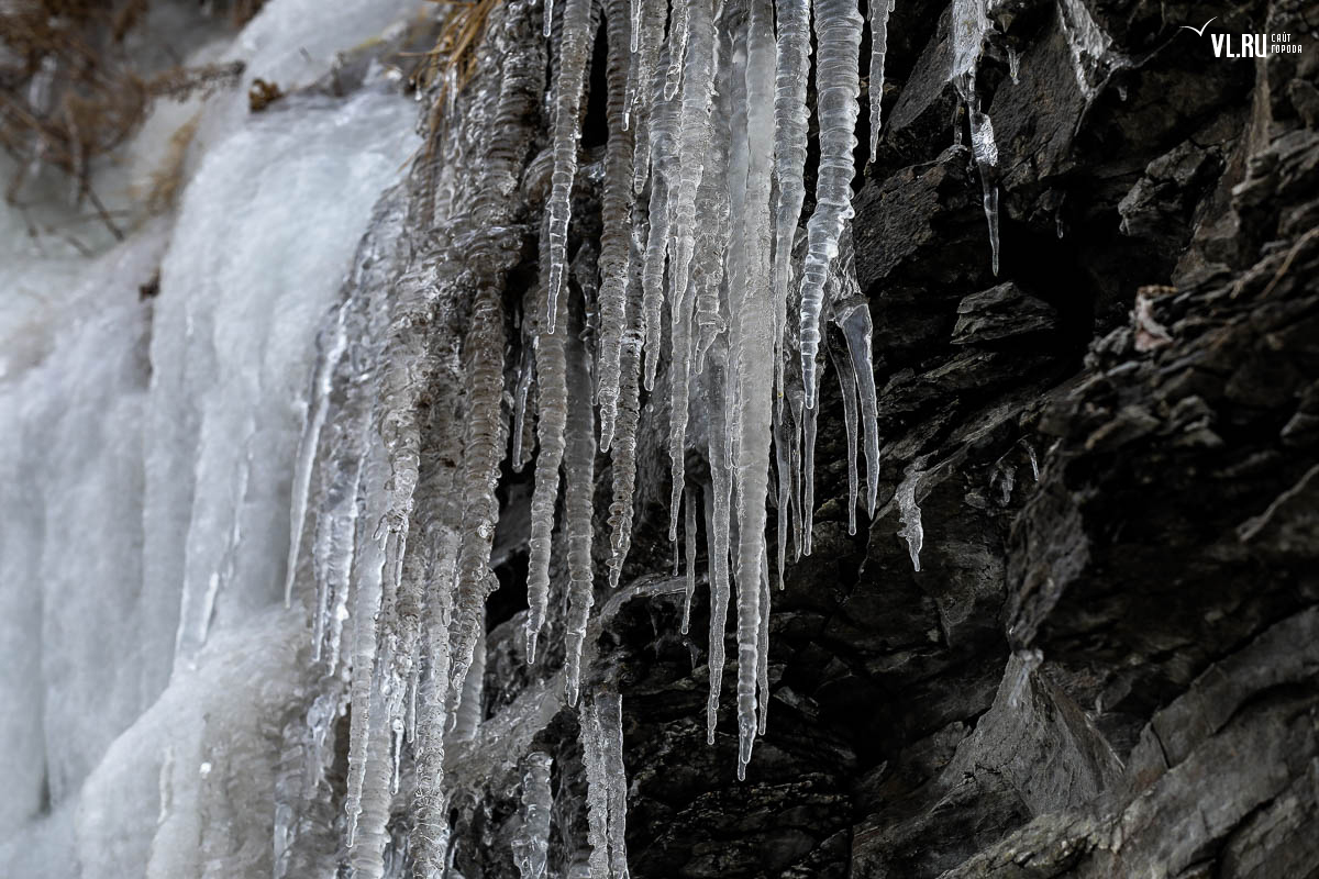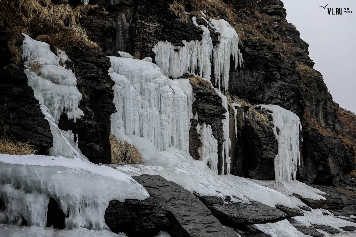 Русском острове. Длинные сосульки, украшающие мыс, нередко попадают в