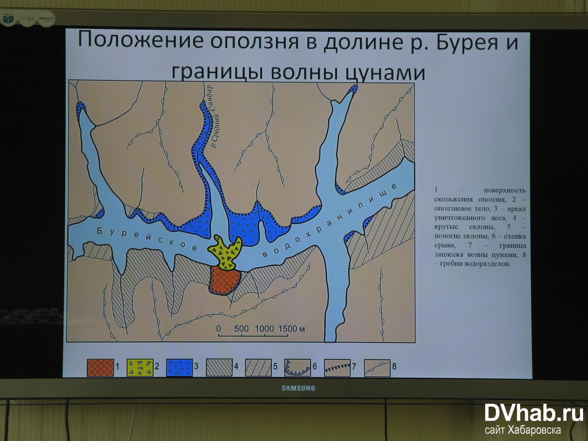 — Там прекрасно видно место срыва горной породы, путь скольжения и обязательные элементы оползневого склона. Гигантская масса сошла с крутого склона на огромной скорости в водохранилище. А там вода, и по инерции она выскочила на противоположный берег. Все это случилось днем буквально за пять — десять минут, — сообщил Алексей Махинов.Общая площадь надводной части составляет более 270 тысяч квадратных метров. Протяженность плотины поперек русла реки Бурея составила 800 метров. А ширина неодинаковая: в самом узком месте — около 150 метров, в широком — 620. Объем оползневого тела, включая его подводную часть, равен 24,5 миллиона кубических метров. Оно практически полностью находится в реке. Над водой всего лишь одна шестая его часть.